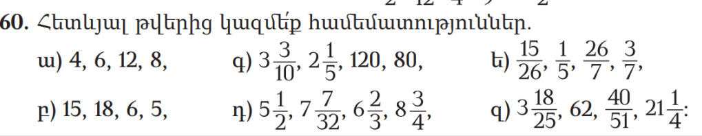 բ) 25 և 125=20, դ) 800 և 160=500, զ) 5 3/5 և 92=